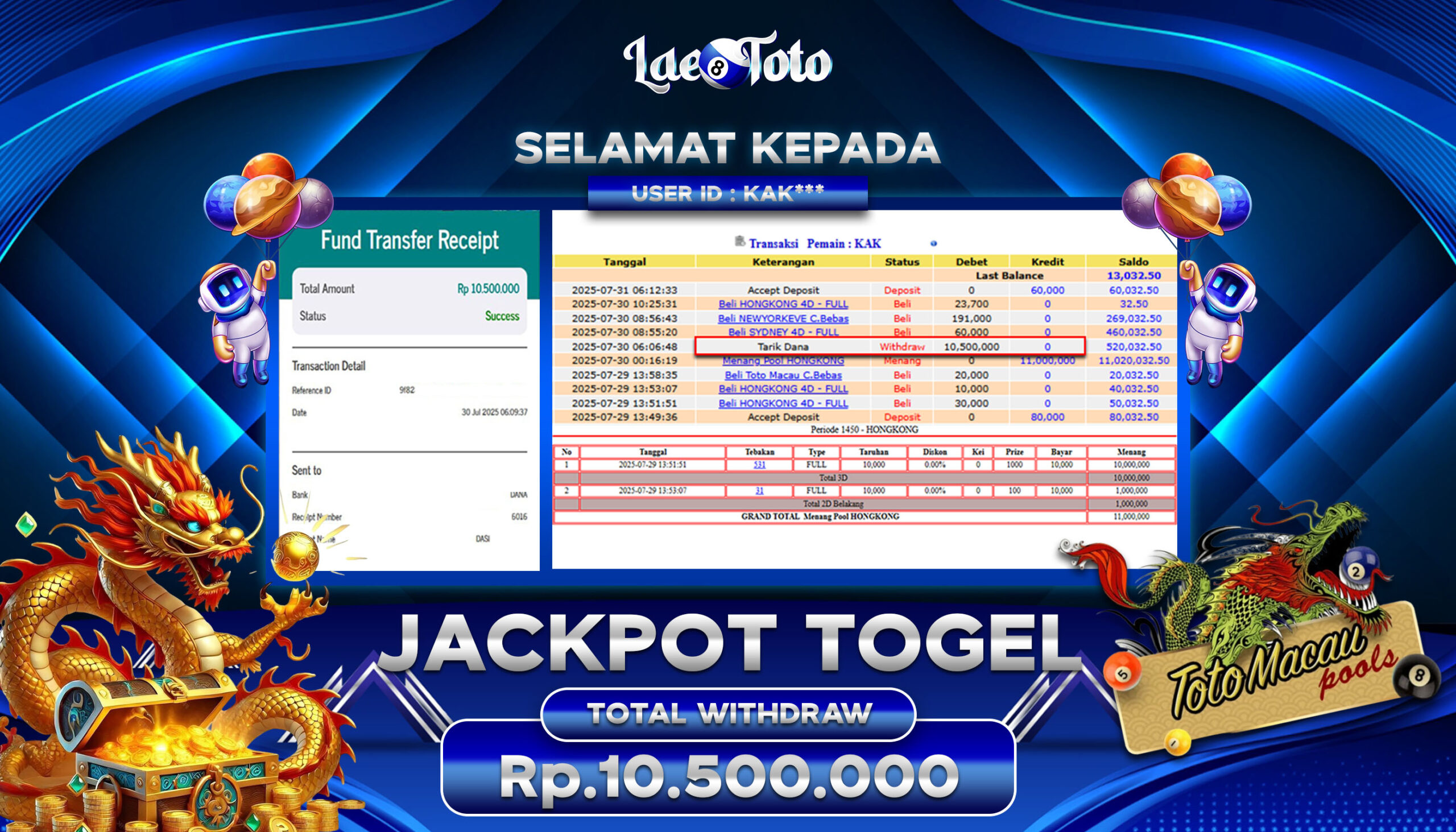 Selamat kepada Member User ID: KAK**** yang telah berhasil mendapatkan kemenangan besar pada permainan TOTOMACAU LAETOTO sebesar RP 10.500.000 DIBAYAR LUNAS!! Setelah member mengisi form withdraw dengan waktu kurang lebih 5-10 menit, pihak LAETOTO telah melakukan transfer kepada pemenang dengan User ID tersebut dan saldo sudah dapat dicairkan oleh pemenang. Bukti pembayaran yang kami berikan adalah SAH/VALID, didapatkan melalui tanda transfer transaksi dari bank yang dituju.